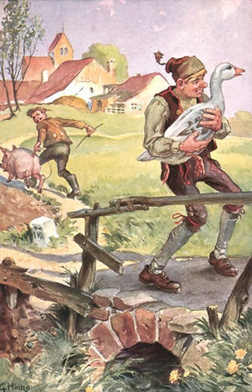 At some point, he stopped to rest, as the horse appeared thirsty and tired from the road. An old farmer with a goose happened upon them. The farmer said to Hans, “Tell me, I see your horse is tired, and your journey must still be long. Why not trade your horse for my goose? You’ll have a good meal and then continue on your way home.” Hans, who was indeed hungry, looked at the goose and agreed. He took the goose, prepared himself a good meal, and continued home.